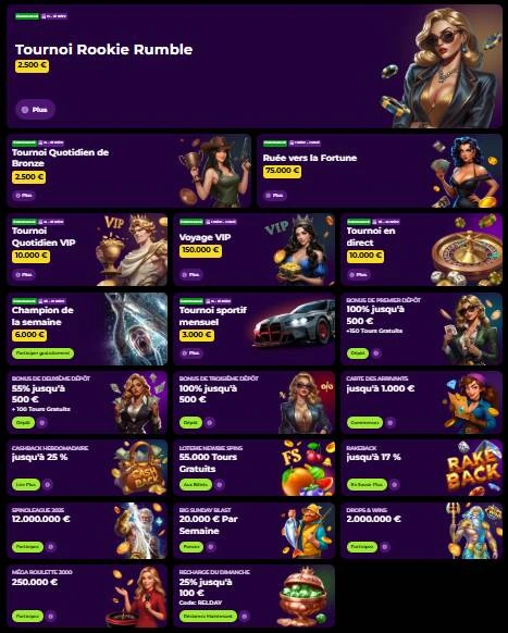 L’espace promotionnel de Spin Mama casino propose plusieurs compétitions : le Rookie Rumble à 2 500 €, le Champion de la semaine à 6 000 €, ou encore le Voyage VIP à 150 000 €. La loterie Newbie Spins permet, elle, de gagner jusqu’à 55 000 tours gratuits, avec un ticket pour chaque 10 € de dépôt.